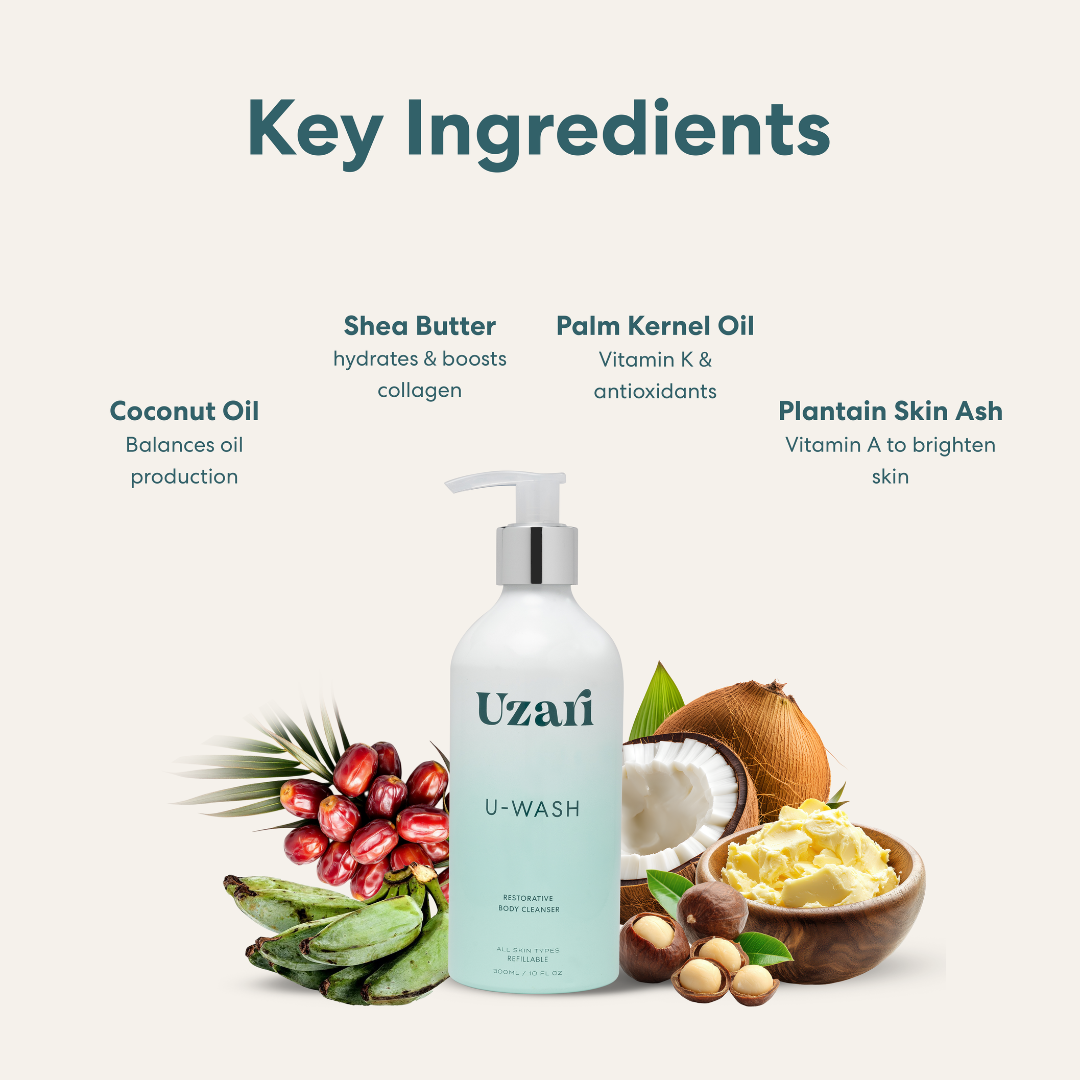 Powered by authentic African Black Soap and enriched with plant-based oils and antioxidants, U-Wash is a restorative body cleanser designed to rebalance, clarify, and nourish your skin—without stripping its natural barrier.