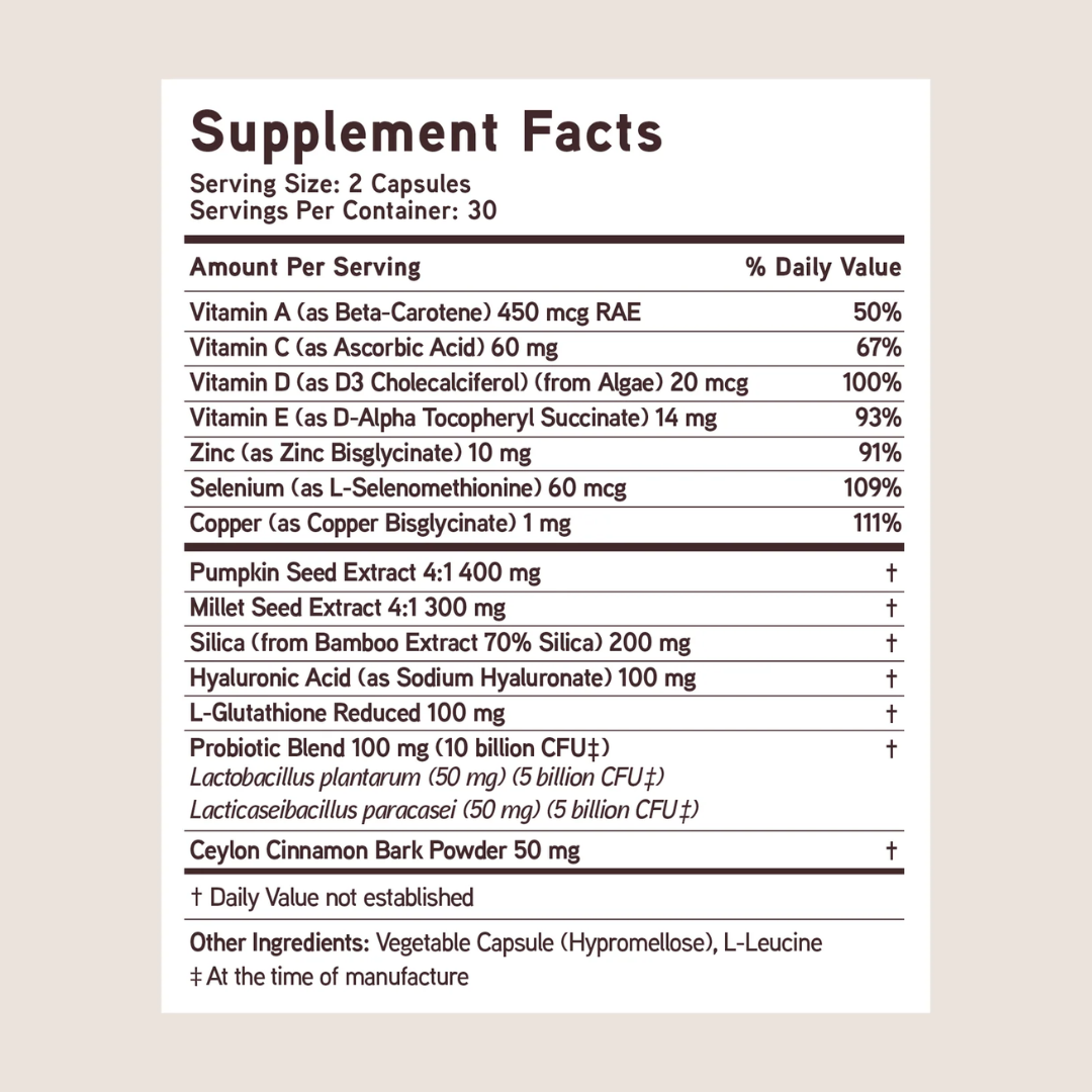 Daily Glow features a targeted blend of vitamins, minerals, botanicals, and probiotics formulated to support melanin-rich skin and textured hair. It includes essential nutrients like Vitamin A (450 mcg), Vitamin C (60 mg), Vitamin D3 from algae (20 mcg), and Vitamin E (14 mg), plus minerals such as zinc, selenium, and copper to help support skin clarity and hair strength. Plant-based ingredients include pumpkin seed extract, millet seed extract, and silica from bamboo to nourish hair and scalp. Hyaluronic acid and L-glutathione promote hydration and even skin tone, while a 10-billion CFU probiotic blend supports digestive health. The formula also includes Ceylon cinnamon bark for added antioxidant support. Daily Glow is vegan, non-GMO, gluten-free, dairy-free, soy-free, and made without fillers.